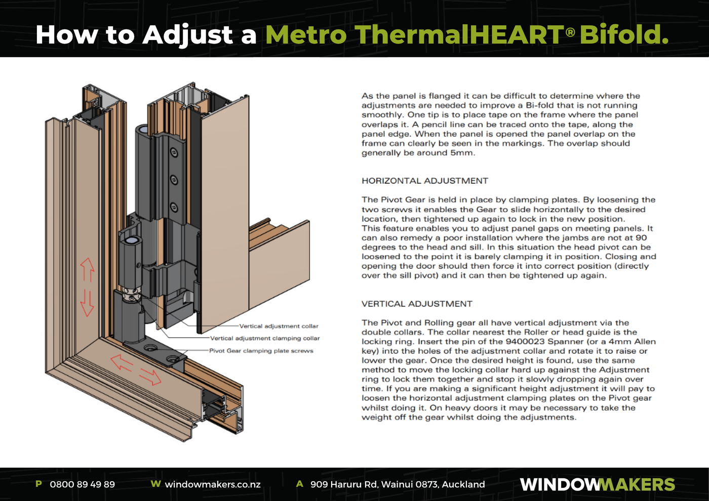 Learn how to fine-tune the panel position on your bifold using horizontal and vertical adjustments to correct misalignment, gaps, or operation issues.